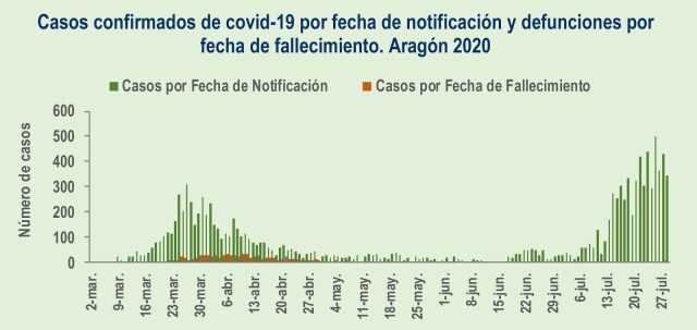 En algunas CCAA los casos han aumentado mucho y casi superan en número, si no lo han hecho ya, los casos de la primera ola epidémica. Tal es el caso, por ejemplo, de Aragón como se muestra en su último boletín epidemiológico correspondiente a la semana 30 (del 20 al 26 de julio) (aquí). Pese a ello, el número de fallecimientos que ahora se dan en Aragón nada tiene que ver con los ocurridos en la primera ola de marzo-abril.