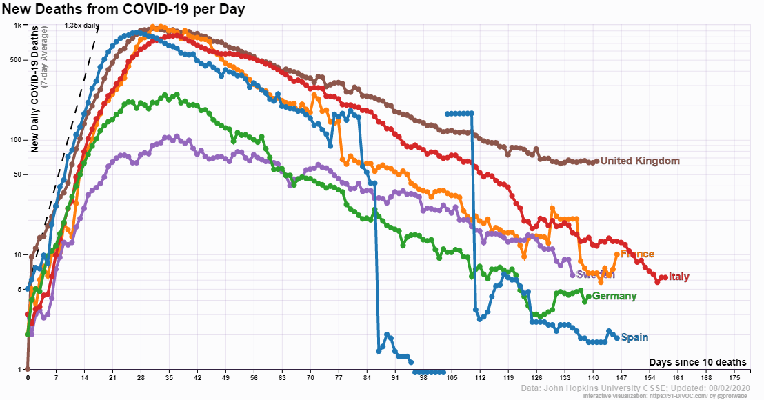 Acudo a las mismas fuentes. La John Hopkins sólo ofrece datos absolutos (New Deaths from COVID-19 per Day) (aquí), mientras que los datos relativos (Daily new conformed COVID-19 deaths per million people) proceden nuevamente del CDC europeo (aquí). En términos absolutos somos ahora lo que menos mortalidad tenemos y en términos relativos también disputándonos la menor mortalidad por millón de habitantes en las últimas semanas con Alemania.
