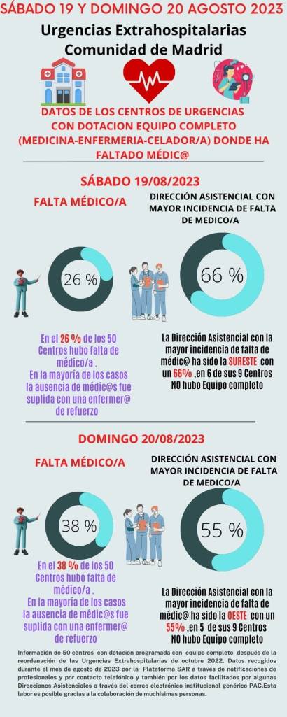 Los nuevos datos que vamos conociendo de cobertura médica en los diferentes PAC, nos muestran una situación cada día más caótica, preocupante y peligrosa para la salud de los Madrileños. Tanto de los residentes habituales, como de aquellos que visitan nuestras zonas rurales atraídos por la gran variedad de atracciones turísticas de nuestra región, abundante en ofertas de ocio, culturales y gastronómicas. Turistas que por un día, por un fin de semana, campamentos, campings y segundas residencias, se convierten en posibles usuarios de nuestras Urgencias Extrahospitalarias, ya que abundan los accidentes, picaduras, golpes de calor, etc que se añaden a cualquier otra patología susceptible de necesitar asistencia sanitaria por equipos completos y se encuentran con que no siempre los hay y no saben donde acudir. Una circunstancia que ante una situación crono-dependiente significa la diferencia entre la salud y la enfermedad o la muerte.