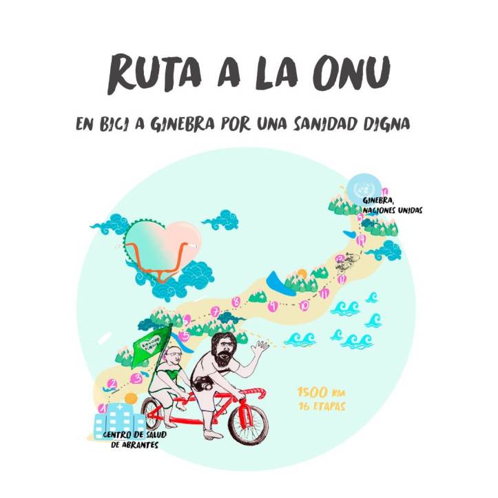 Dos ciudadanos de Madrid, miembros de la Asamblea Popular de Carabanchel, Jorge y Alberto con el equipo de apoyo de Rian y Belén están recorriendo en bicicleta 1500 kilómetros desde el Centro de Salud de Abrantes en Madrid hasta la Oficina del Alto Comisionado de la ONU para los Derechos Humanos en Ginebra.